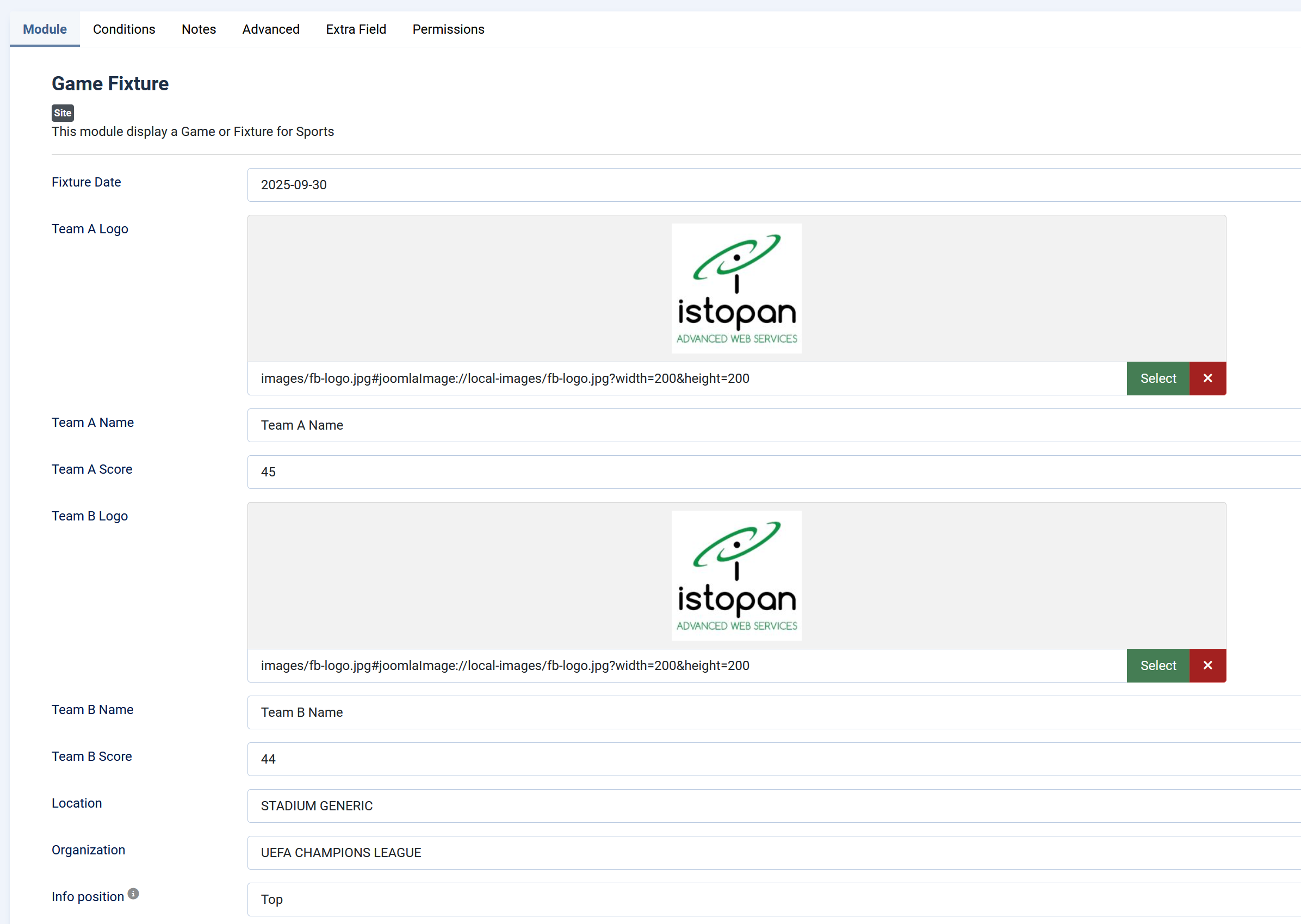 The Game Fixture module displays a match or game between 2 teams. Can be used for next game or last game.
